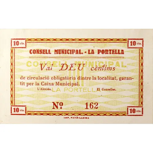 10 cts. CONSELL MUNICIPAL. - LA PORTELLA Val DEU cèntims de circulació obligatòria dintre la localitat, garantit per la Caixa Municipal. IMP. PAYÀ - LLEIDA (Translation: Municipal Council La Portella It`s worth Ten Centimos of cmandatory circulation within the town, guaranteed by the Municipal Treasury.) |
