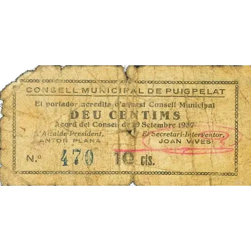 Obverse lettering CONSELL MUNICIPAL DE PUIGPELAT El portador acredita d`aquest Consell Municipal DEU CENTIMS Acord del Consell de 19 Setembre 1937 10 cts.