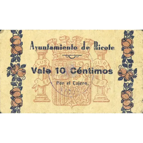 Ayuntamiento de Ricote Vale 10 Céntimos (Translation: City Council of Ricote It`s worth 10 Centimos) |
