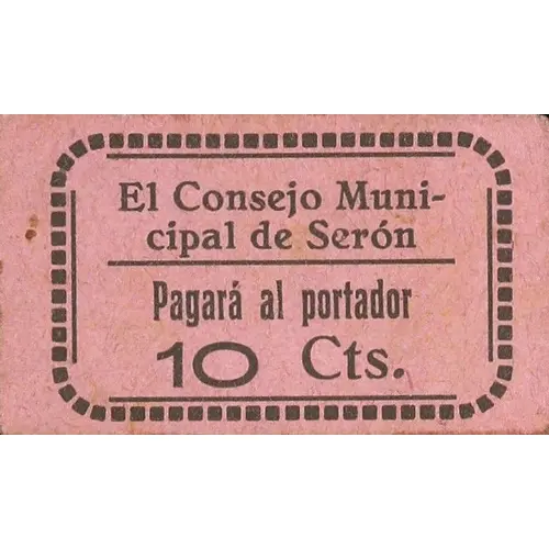 El Consejo Municipal de Serón Pagará al portador 10 Cts. (Translation: The Municipal Council of Serón Will pay the bearer 10 Centimos) |
