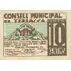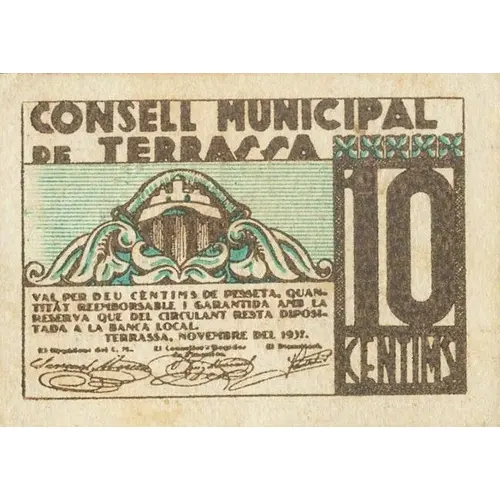 CONSELL MUNICIPAL DE TERRASSA 10 CENTIMS VAL PER DEU CÈNTIMS DE PESSETA, QUANTITAT REEMBORSABLE I GARANTIDA AMB LA RESERVA QUE DEL CIRCULANT RESTA DIPOSITADA A LA BANCA LOCAL. TERRASSA, NOVEMBRE DEL 1937. (Translation: Municipal Council of Terrassa 10 Centimos It is valid for Ten Centimos of peseta, an amount refundable and guaranteed with the remaining reserve of the circulating currency deposited in the local Bank. Terrassa, November 1937.) |
