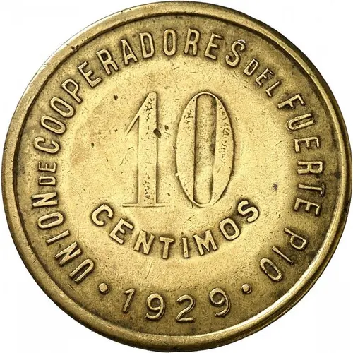 | Obverse lettering | 10 CENTIMOS UNION DE COOPERADORES DEL FUERTE PIO · 1929 · (Translation: Union of Cooperatos of Fuerte Pio) |