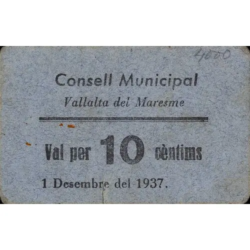 Consell Municipal Vallalta del Maresme Val per 10 cèntims 1 Desembre del 1937. (Translation: Municipal Council Vallalta del Maresme Voucher for 10 Centimos December 1, 1937.) |