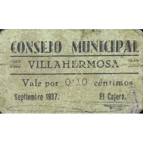 CONSEJO MUNICIPAL VILLAHERMOSA Vale por 0`10 céntimos. Septiembre 1937 (Translation: Municipal Council Villahermosa Voucher for 0.10 Centimos September, 1937) |