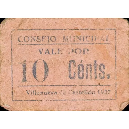 CONSEJO MUNICIPAL VALE POR 10 Cents. Villanueva de Castellón 1937 (Translation: Municipal Council Valid for 10 Centimos Villanueva de Castellón 1937) |