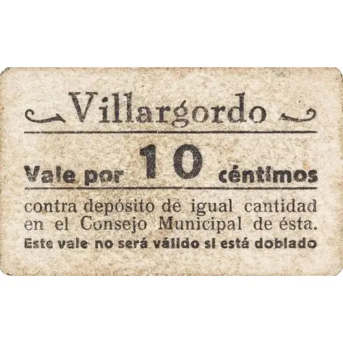 Villargordo Vale por 10 céntimos contra depósito de igual cantidad en el Consejo Municipal de ésta. Este vale no será válido si está doblado (Translation: Villargordo Voucher for 10 Centimos against deposit of the same amount in the Municipal Council of this. This voucher will not be valid if it is folded) |