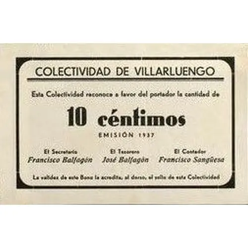 نوشته‌های روی اسکناس COLECTIVIDAD DE VILLARLUENGO Esta Colectividad reconoce a favor del portador la cantidad de 10 céntimos EMISIÓN 1937 La validez de este Bono la acredita, al dorso, el sello de esta Colectividad