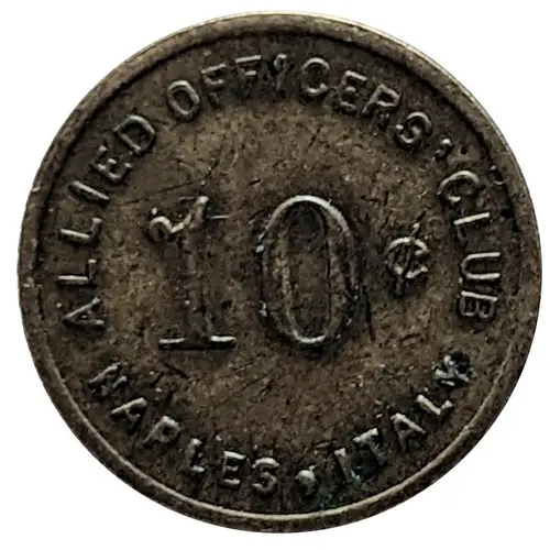 Reverse lettering ALLIED OFFICERS` CLUB 10¢ NAPLES,ITALY