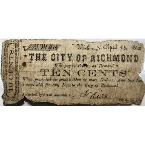 | Obverse lettering | Richmond April 14, 1862 THE CITY OF RICHMOND Will pay the Bearer, on Demand TEN CENTS When presented in sums of One or more Dollars. And this Note is receivable for any Dues to the City of Richmond |