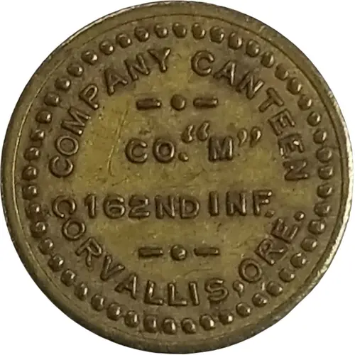 | Obverse lettering | COMPANY CANTEEN CO. `M` 162ND INF. CORVALLIS, ORE. |