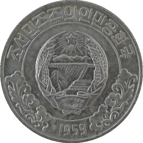 Artistry: Adhering to the Socialist Realism artistic school, the 10 Chon coin's design is clear, functional, and symbolic. No specific engraver is attributed, typical for state coinage. The obverse prominently features North Korea's national emblem: a hydroelectric power station beneath Mount Paektu, framed by rice ears and topped with a red star, symbolizing industrial and agricultural progress. The reverse displays the denomination "10 CHON" and the year "1959" straightforwardly, reflecting the utilitarian purpose of this specific issue.