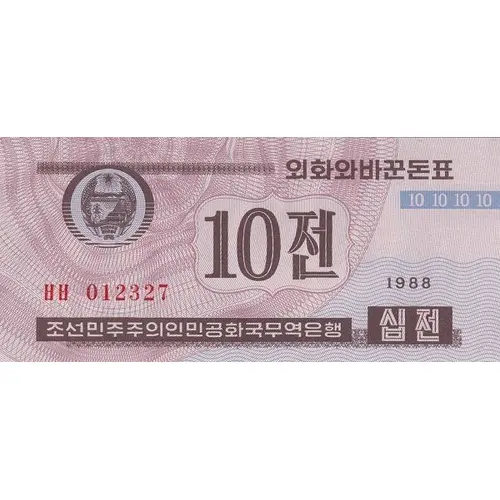 | Obverse lettering | 외화와바꾼돈표 10 십전 1988 조선민주주의인민공화국무역은행 십전 (Translation: Foreign currency exchange, 10 Chon, Foreign Trade Bank of the Democratic People`s Republic of Korea, Ten Chon) |