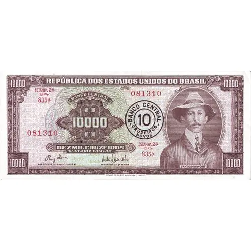 (Translation: Republic of the United States of Brazil Central Bank Central Bank 10 Cruzeiros Novos Ten Thousand Cruzeiros Legal Amount President of the Central Bank Finance Minister Santos-Dumont Thomas De La Rue & Company, Limited.) |