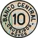 Sepia on polychrome, in chalcography and offset. On the right, the figure of Alberto Santos Dumont (1873-1932). Superimposed on the figure of Santos Dumont, a round stamp with the words `BANCO CENTRAL - 10 CRUZEIROS NOVOS`. Above couplet `REPÚBLICA DOS ESTADOS UNIDOS DO BRASIL` (Republic of the United States of Brazil). Below the inscription `DEZ MIL CRUZEIROS / VALOR LEGAL` (Five Thousand Cruzeiros / Legal Amount), topped by the value in figures and the writing `BANCO CENTRAL` (Central Bank). On the left, print number, serial number (above), the sequence number (center) and signature of Presidente of the Central Bank (below). On the right, the sequence number (above), print number, serial number (center) and signature of Finance Minister (below).