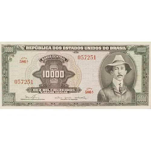 | Obverse description | Dark grey on polychrome, in chalcography and offset. On the right, the figure of Alberto Santos Dumont (1873-1932). Superimposed on the figure of Santos Dumont, a round stamp with the words ` BANCO CENTRAL - 10 CRUZEIROS NOVOS`. Above couplet `REPÚBLICA DOS ESTADOS UNIDOS DO BRASIL` (Republic of the United States of Brazil). Below the inscription `DEZ MIL CRUZEIROS / VALOR LEGAL` (Five Thousand Cruzeiros / Legal Amount), topped by the value in figures and the writing `BANCO CENTRAL` (Central Bank). On the left, serial number (above), the sequence number (center) and signature of Presidente of the Central Bank (below). On the right, the sequence number (above), serial number (center) and signature of Finance Minister (below). |