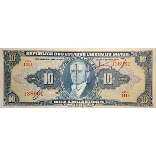 | Obverse lettering | REPÚBLICA DOS ESTADOS UNIDOS DO BRASIL SE PAGARÁ AO PORTADOR DESTA A QUANTIA DE 10 NO TESOURO NACIONAL 10 DEZ CRUZEIROS GETULIO VARGAS VALOR RECEBIDO AMERICAN BANK NOTE COMPANY. (Translation: Republic of United States of Brazil will be paid to the carrier of this amount of Ten Cruzeiros in the National Treasury 10 10 Getulio Vargas Amount Received American Bank Note Company.) |