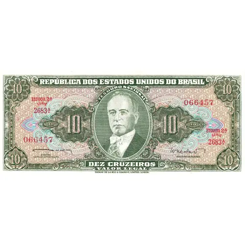 REPÚBLICA DOS ESTADOS UNIDOS DO BRASIL 10 TESOURO NACIONAL 10 DEZ CRUZEIROS GETULIO VARGAS VALOR LEGAL THOMAS DE LA RUE & COMPANY, LIMITED, LONDON. (Translation: Republic of United States of Brazil Ten Cruzeiros National Treasury 10 10 Getulio Vargas Legal Value Thomas De La Rue & Company, Limited, London.) |