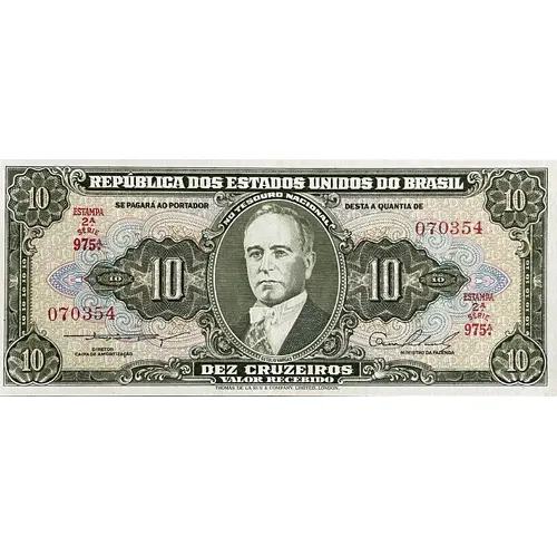| Obverse description | Green on polychrome, in calchography and offset. In the center, wrapped in a decorated frame, the portrait of Getúlio Dornelles Vargas (President of the Republic 1930 - 1945 / 1951 - 1954), flanked by the numerals 10. |