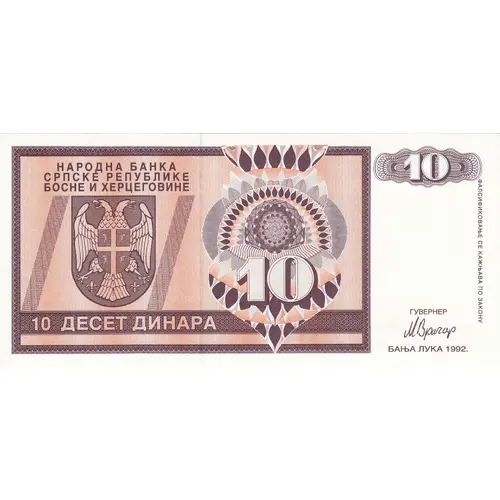 НАРОДНА БАНКА СРПСКЕ РЕПУБЛИКЕ БОСНЕ И ХЕРЦЕГОВИНЕ 10 Десет Динара (Translation: National Bank of the Serbian Republic of Bosnia and Herzegovina 10 Ten Dinara) |