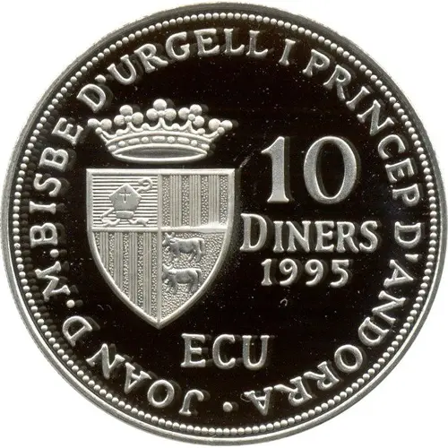 | Chữ khắc mặt trước | · JOAN D.M.BISBE D`URGELLI I PRINCEP D`ANDORRA 10 DINERS 1995 ECU (Translation: Joan D.M. Bishop of Urgell and Prince of Andorra) |