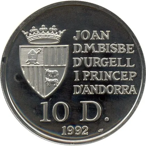 | Obverse lettering | JOAN D.M BISBE D`URGELL I PRINCEP D`ANDORRA 10 D. 1992 (Translation: Joan D.M. Bishop of Urgell and Prince of Andorra) |