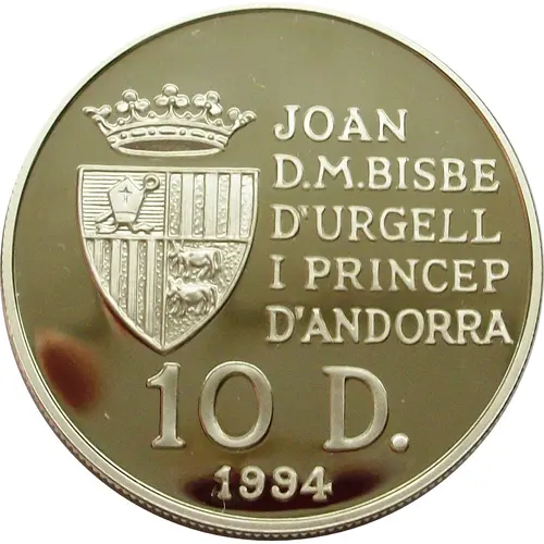 | Obverse lettering | JOAN D.M BISBE D`URGELL I PRINCEP D`ANDORRA 10 D. 1994 (Translation: Joan D.M. Bishop of Urgell and Prince of Andorra) |