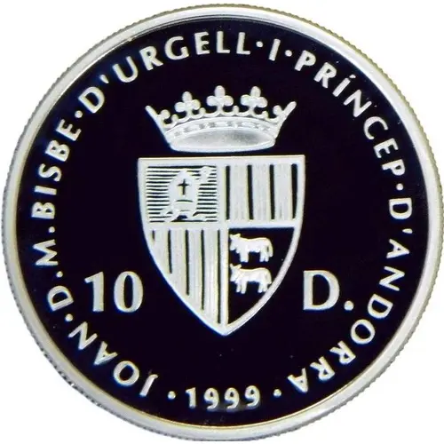 | Averslegende | JOAN · D . M . BISBE · D`URGELL · I · PRINCEP · D`ANDORRA 10 D . · 1999 · (Translation: Joan D.M. Bishop of Urgell and Prince of Andorra) |