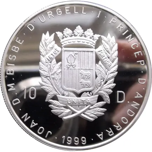 | 正面铭文 | JOAN · D . M . BISBE · D`URGELL · I · PRINCEP · D`ANDORRA 10 D . VIRTUS - UNITA - FORTIOR · 1999 · (Translation: Joan D.M. Bishop of Urgell and Prince of Andorra United virtue is stronger) |