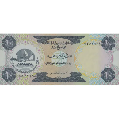 | Legenda rewersu | UNITED ARAB EMIRATES CURRENCY BOARD 10 TEN DIRHAMS ABU-DHABI DUBAI SHARJAH AJMAN UM AL QIWAIN FUJEIRA RAS AL KHAIMA ABU-DHABI DUBAI |