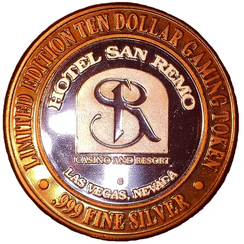 LIMITED EDITION TEN DOLLAR GAMING TOKEN HOTEL SAN REMO SR CASINO AND RESORT G LAS VEGAS, NEVADA .999 FINE SILVER |