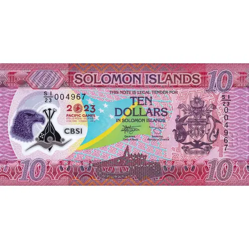 | Obverse description | Head of eagle; three paddles; Pacific Games log; CBSI in Argentum patch; Solomon Islands flag; fish carvings, Solomon Islands coat of arms. |