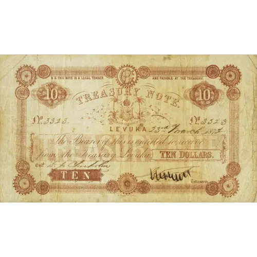 | Chữ khắc mặt trước | N.B. THIS NOTE IS LEGAL TENDER AND PAYABLE AT THE TREASURY CR TREASURY NOTE LEKUVA The Bearer of this is entitled to receive from The Treasury, Lekuva TEN DOLLARS. TEN S. T. Leigh & co Sydney |