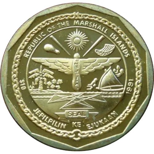 | Obverse lettering | REPUBLIC OF THE MARSHALL ISLANDS $10 1991 SEAL JEPILPLIN KE EJUKAAN (Translation: Accomplishment Through Joint Effort) |