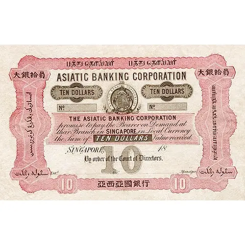 | Obverse lettering | ASIATIC BANKING CORPORATION TEN DOLLARS TEN DOLLARS THE ASIATIC BANKING CORPORATION promise to pay the bearer on demand at their branch in SINGAPORE in local currency the sum of TEN DOLLARS value received SINGAPORE By order of the Court of Directors |