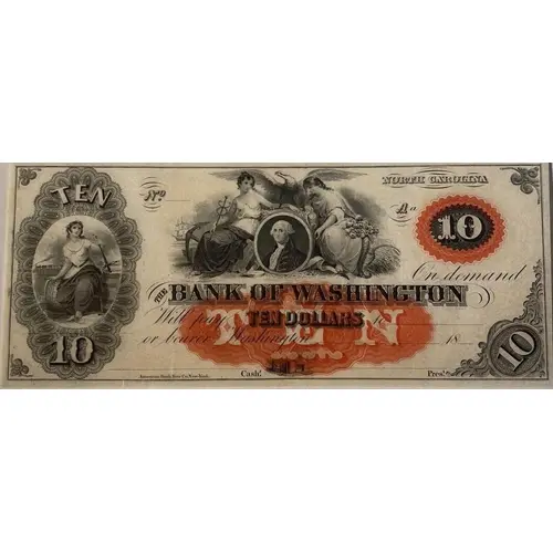 | Obverse lettering | TEN 10 NORTH CAROLINA No._________ A On demand THE BANK OF WASHINGTON will pay TEN DOLLARS to__________________________ or bearer _________________18_____ 10 10 ____________________________________ _________________________ American Bank Note Co. New-York Cash. Pres |