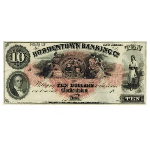 STATE OF NEW JERSEY TEN BORDENTOWN BANKING CO. DIRECTORS AND STOCKHOLDERS RESPONSIBLE Will pay TEN DOLLARS to the bearer on demand BORDENTOWN_______________ 18___ __________________Cash ______________________ Pres TEN American Bank Note Company |