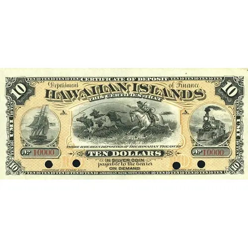 | Obverse lettering | CERTIFICATE OF DEPOSIT Department of Finance HAWAIIAN ISLANDS THIS CERTIFIES THAT THERE HAVE BEEN DEPOSITED AT THE HAWAIIAN TREASURY TEN DOLLARS IN SILVER COIN payable to the bearer ON DEMAND |