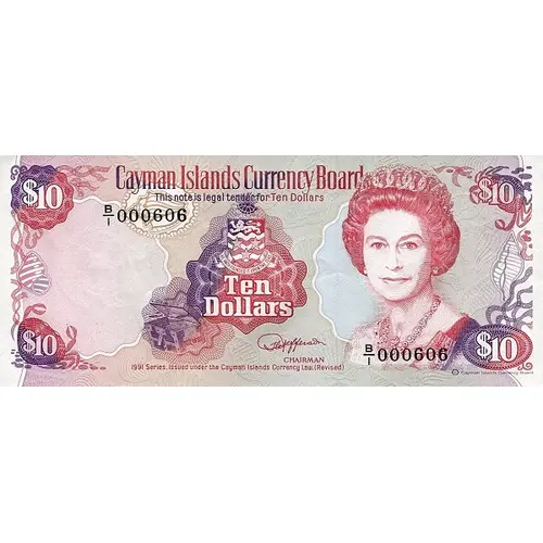 $10 Cayman Islands Currency Board $10 This note is legal tender for Ten Dollars HE HATH FOUNDED IT UPON THE SEAS Ten Dollars CHAIRMAN 1991 Series, Issued under the Cayman Islands Currency Law (Revised) Cayman Islands Currency Board |