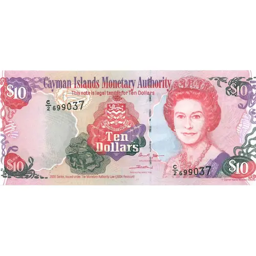 $10 Cayman Islands Monetary Authority $10 This note is legal tender for Ten Dollars HE HATH FOUNDED IT UPON THE SEAS Ten Dollars FINANCIAL SECRETARY MANAGING DIRECTOR 2005 Series. Issued under the Monetary Authority Law (2004 Revision) Cayman Islands Monetary Authority |