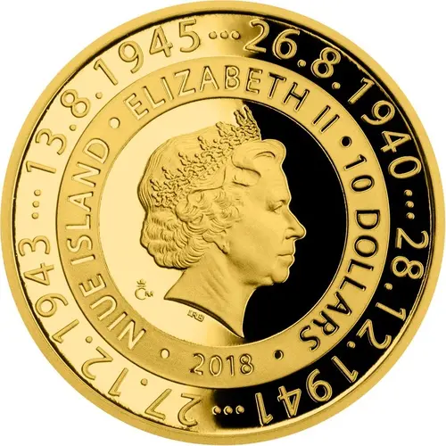 ··· 26.8.1940 ··· 28.12.1941 ··· 27.12.1943 ··· 13.8.1945 · NIUE ISLAND · ELIZABETH II · 10 DOLLARS · CM IRB 2018 |