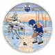 Winter scene, child taking shots at hockey net goal tended by an adult, Edmonton Oilers team logo at top. |
