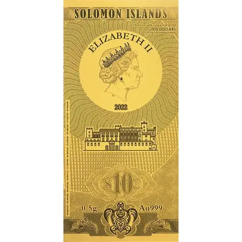 | Obverse lettering | SOLOMON ISLANDS THIS COIN NOTE IS A LEAL TENDER FOR TEN DOLLARS IN THE SOLOMON ISLANDS ELIZABETH II IRB 2022 $10 0.5g Au999 |
