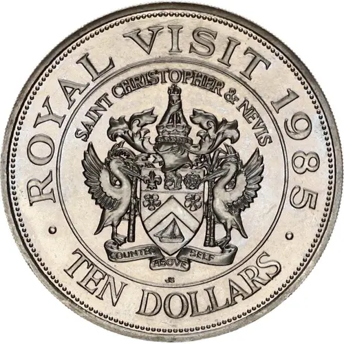 | Legenda do anverso | ROYAL VISIT SAINT CHRISTOPHER & NEVIS COUNTRY ABOVE SELF · TEN DOLLARS · |