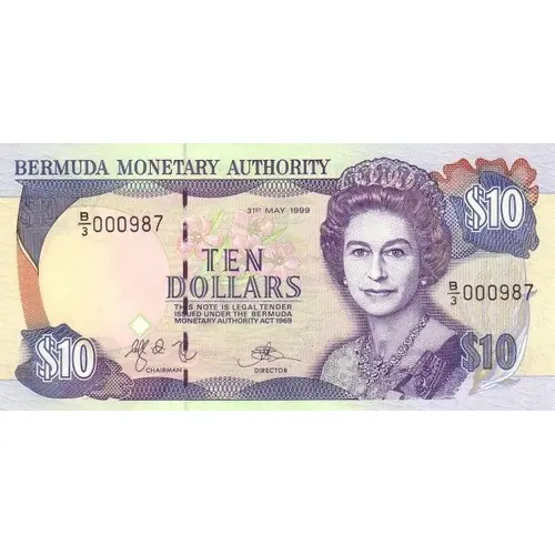 | Obverse lettering | BERMUDA MONETARY AUTHORITY 31st MAY 1999 TEN DOLLARS THIS NOTE IS LEGAL TENDER ISSUED UNDER THE AUTHORITY OF THE BERMUDA MONETARY AUTHORITY ACT 1969 CHAIRMAN DIRECTOR $10 |