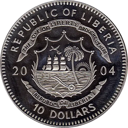 | Obverse lettering | REPUBLIC OF LIBERIA THE LOVE OF LIBERTY BROUGHT US HERE 20 04 REPUBLIC OF LIBERIA 10 DOLLARS |