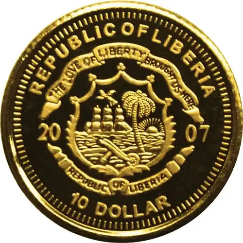 | Obverse lettering | REPUBLIC OF LIBERIA THE LOVE OF LIBERTY BROUGHT US HERE 2007 REPUBLIC OF LIBERIA 10 DOLLAR |
