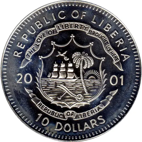| Obverse lettering | REPUBLIC OF LIBERIA THE LOVE OF LIBERTY BROUGHT US HERE 20 01 REPUBLIC OF LIBERIA 10 DOLLARS |
