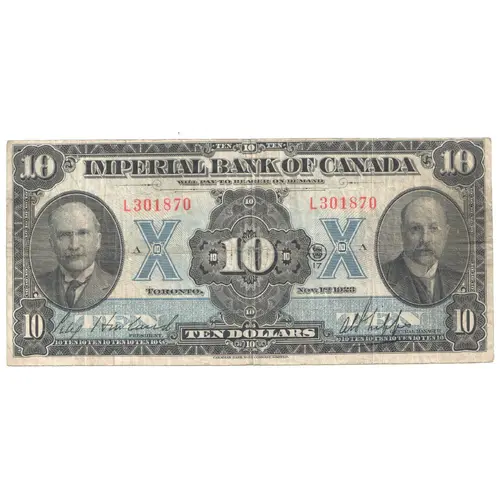 | Obverse lettering | IMPERIAL BANK OF CANADA WILL PAY TO BEARER ON DEMAND 10 TORONTO NOV. 1ST 1923 TEN DOLLARS |