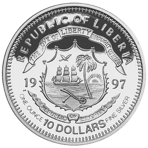 | Obverse lettering | REPUBLIC OF LIBERIA THE LOVE OF LIBERTY BROUGHT US HERE 1997 PM REPUBLIC OF LIBERIA ONE OUNCE 10 DOLLARS FINE SILVER |