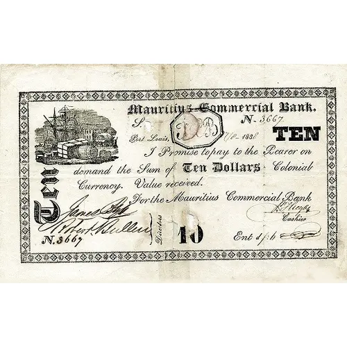 | Obverse lettering | MAURITIUS COMMERCIAL BANK TEN I PROMISE TO PAY THE BEARER ON DEMAND THE SUM OF TEN DOLLARS COLONIAL CURRENCY VALUE RECEIVED FOR THE MAURITIUS COMMERCIAL BANK |